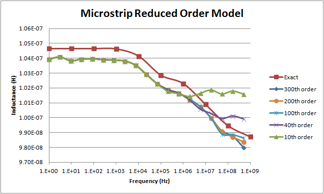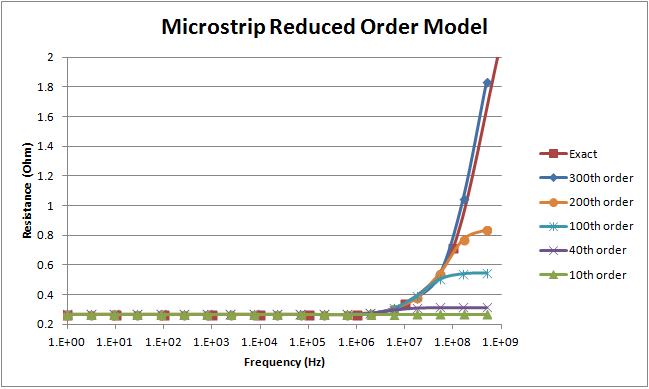 As you can see, the inductance converge for a lower order than the resistance does. However you must remember that the ROM generates a space state model that approximates at the same time both the inductance and the resistance. Now since the strip is relatively far from the plane, actually the inductance does not change much (don't be misled by the picture: note the scale!), while of course the resistance, due to the pure skin effect, has a knee and then increases as the square root of the frequency. So this situation is not so easy to approximate, and requires a higher order. (another note: the 'exact' inductance and the ROM approximations have a small bias, but consider again the scale: this is well below 1%).